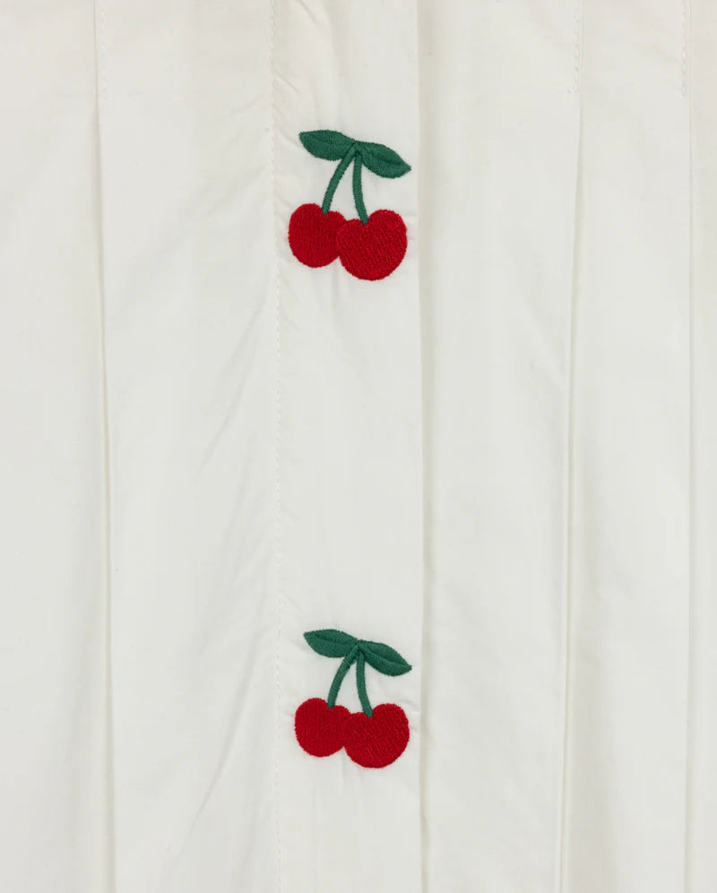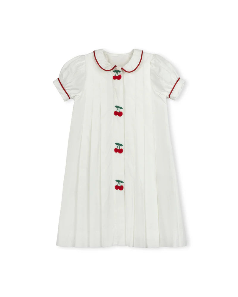 ONE CHILD WHITE EMBROIDERED CHERRY PLEAT DRESS
