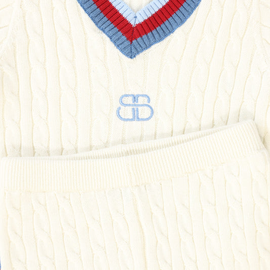 BAMBOO IVORY CABLE KNIT V NECK TRIM SWEATER SET