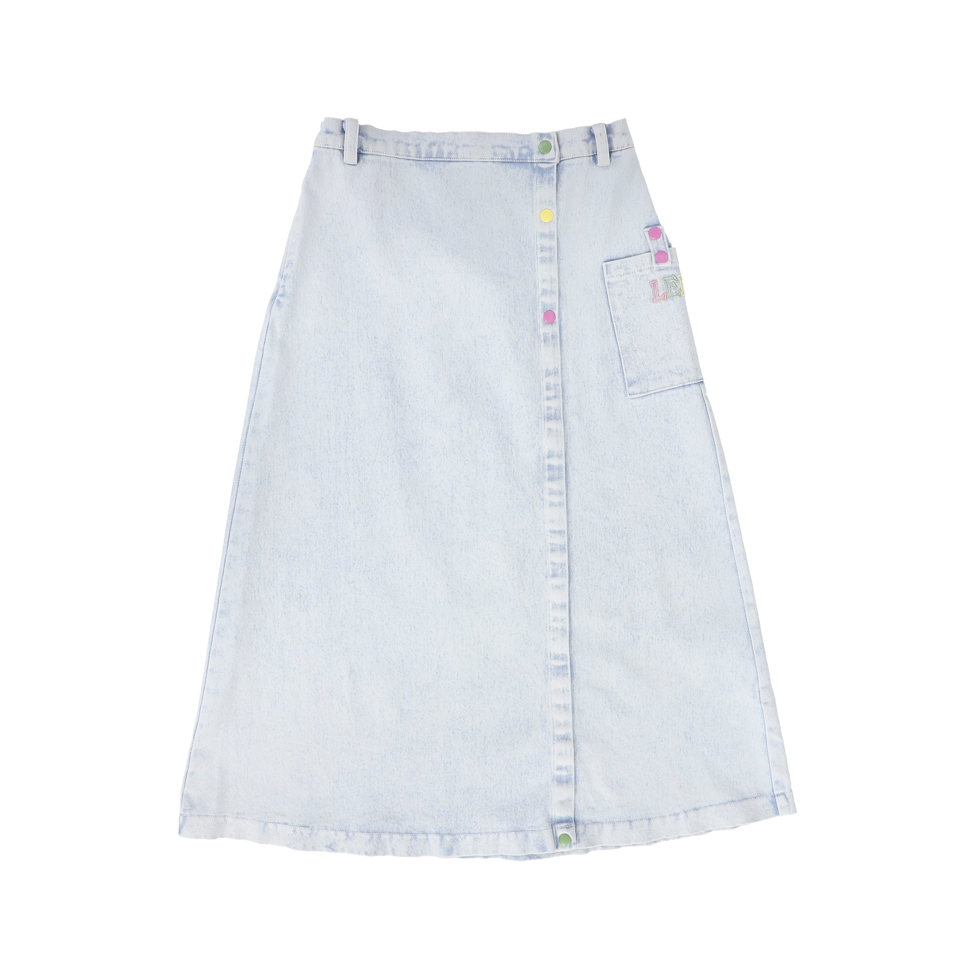 LIMITED EDITION LIGHT BLUE DENIM SNAP TRIM MIDI SKIRT