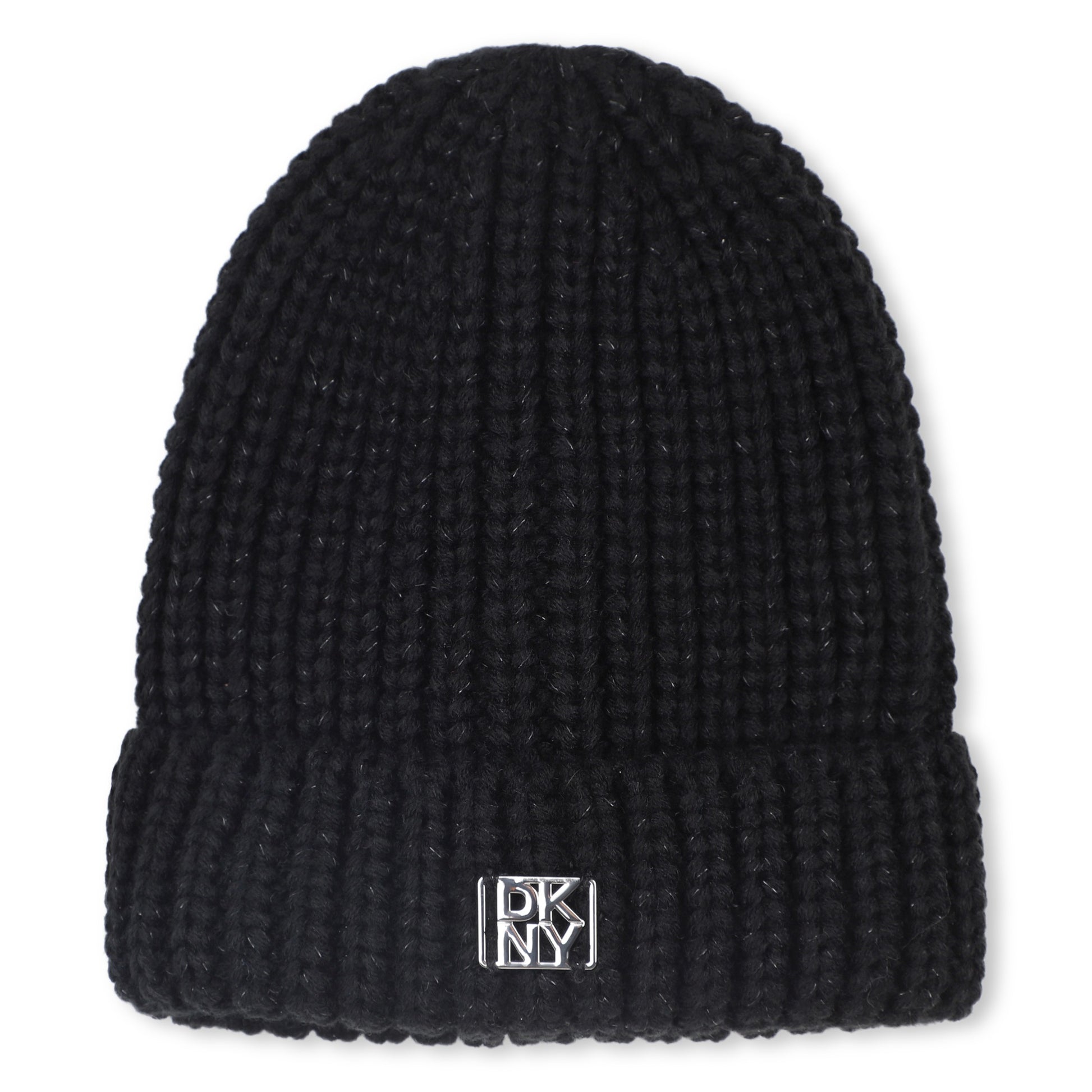 DKNY BLACK RIBBED KNIT LOGO BEANIE