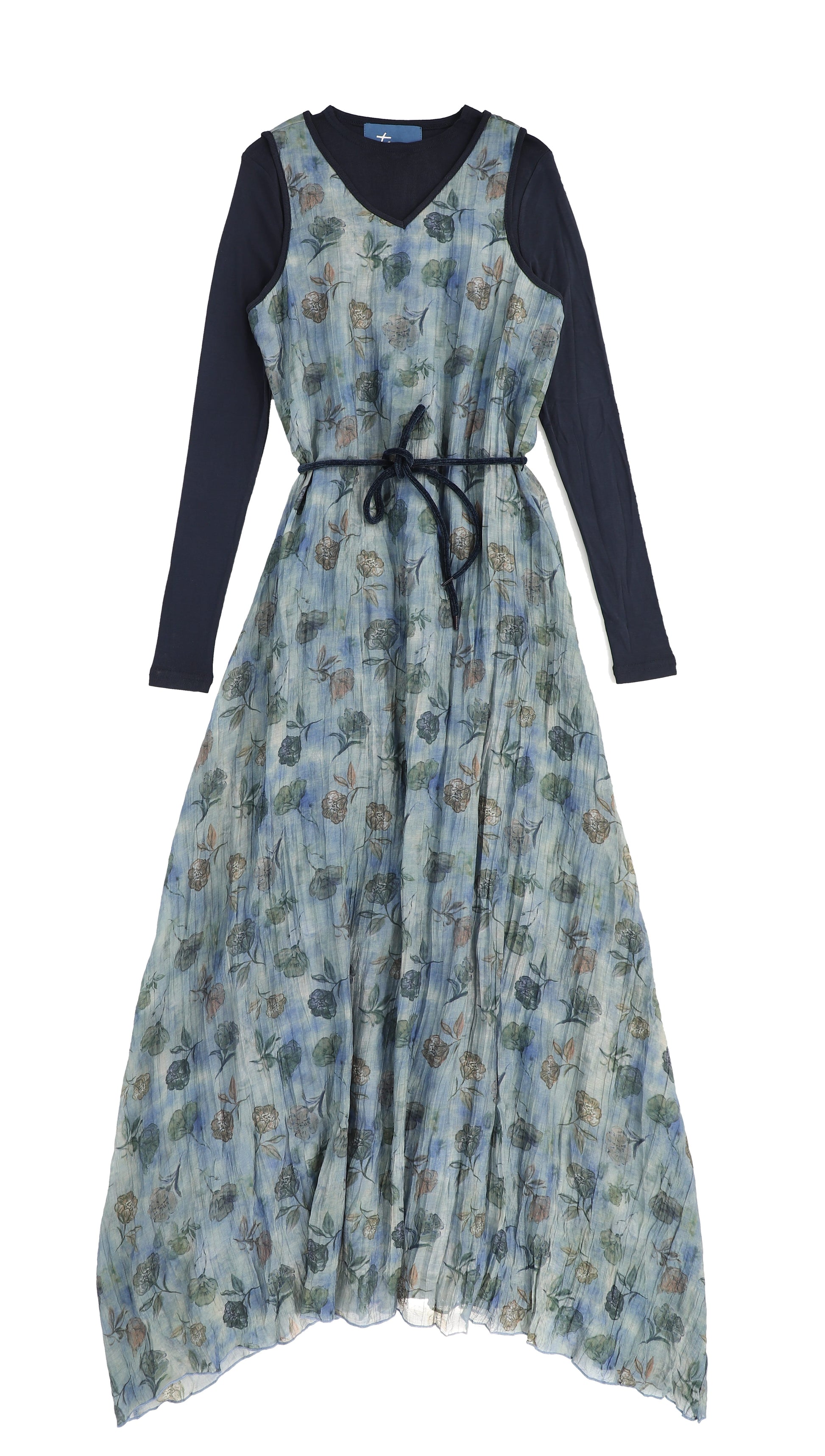 TEA BLUE VELVET PIPED CRINKLE DRESS SET