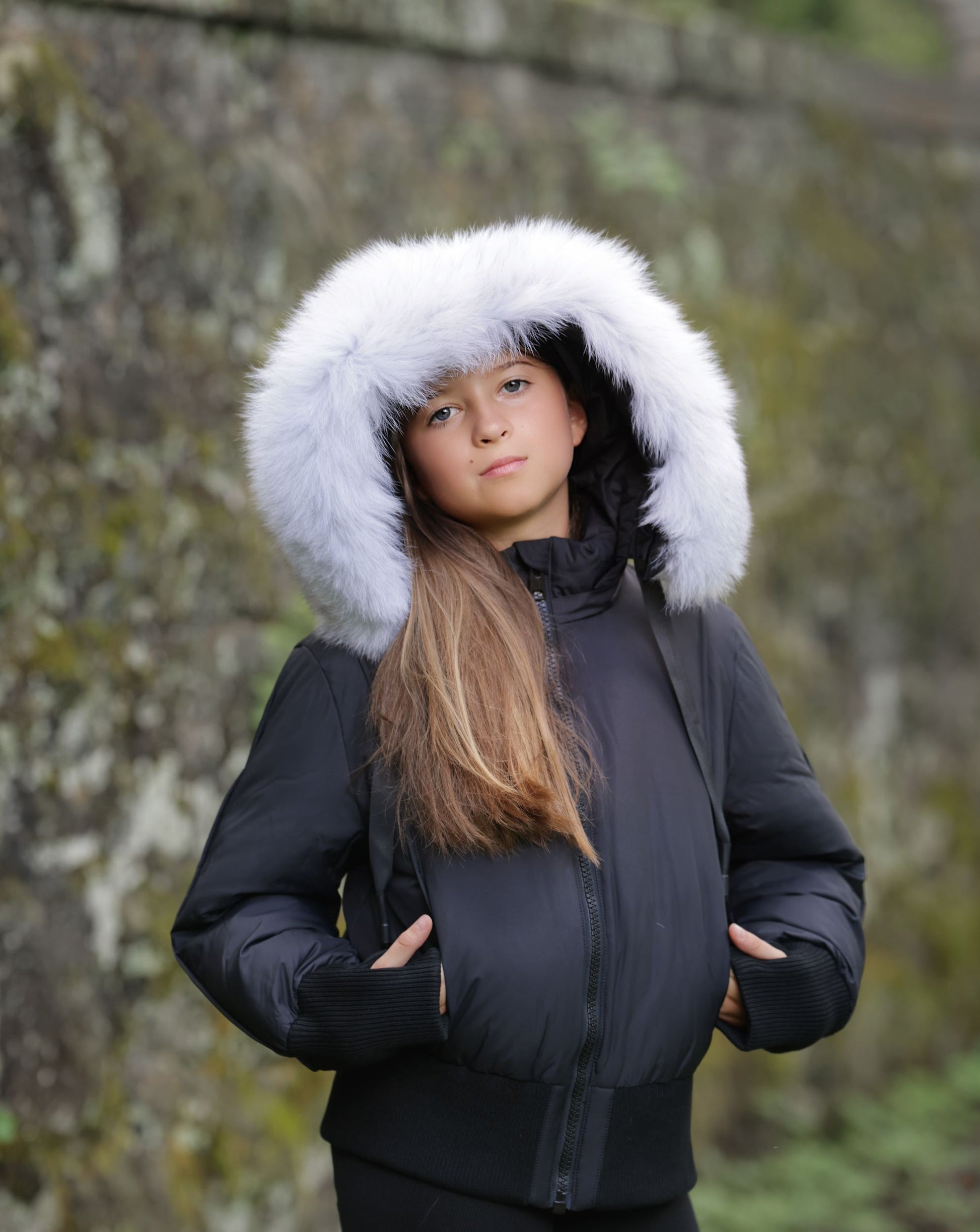 PRAMIE BLACK/WHITE FUR RIBBON TRIM BOMBER COAT