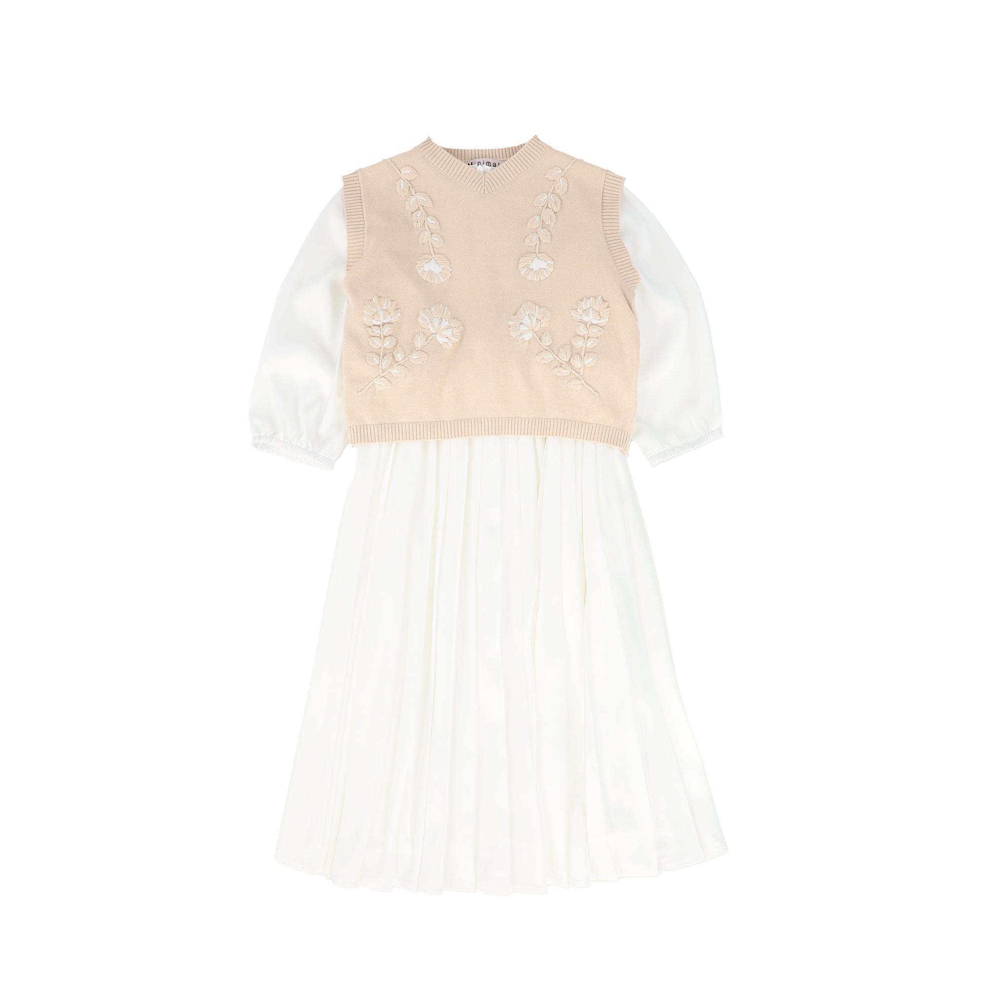MINIMAL TAN EMBROIDERED VEST WITH PLEATED DRESS