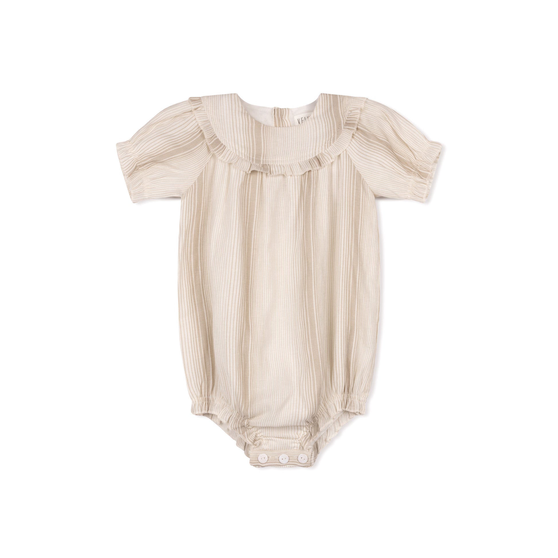 VELVETTE LABEL BEIGE/WHITE STRIPE RUFFLE ROMPER