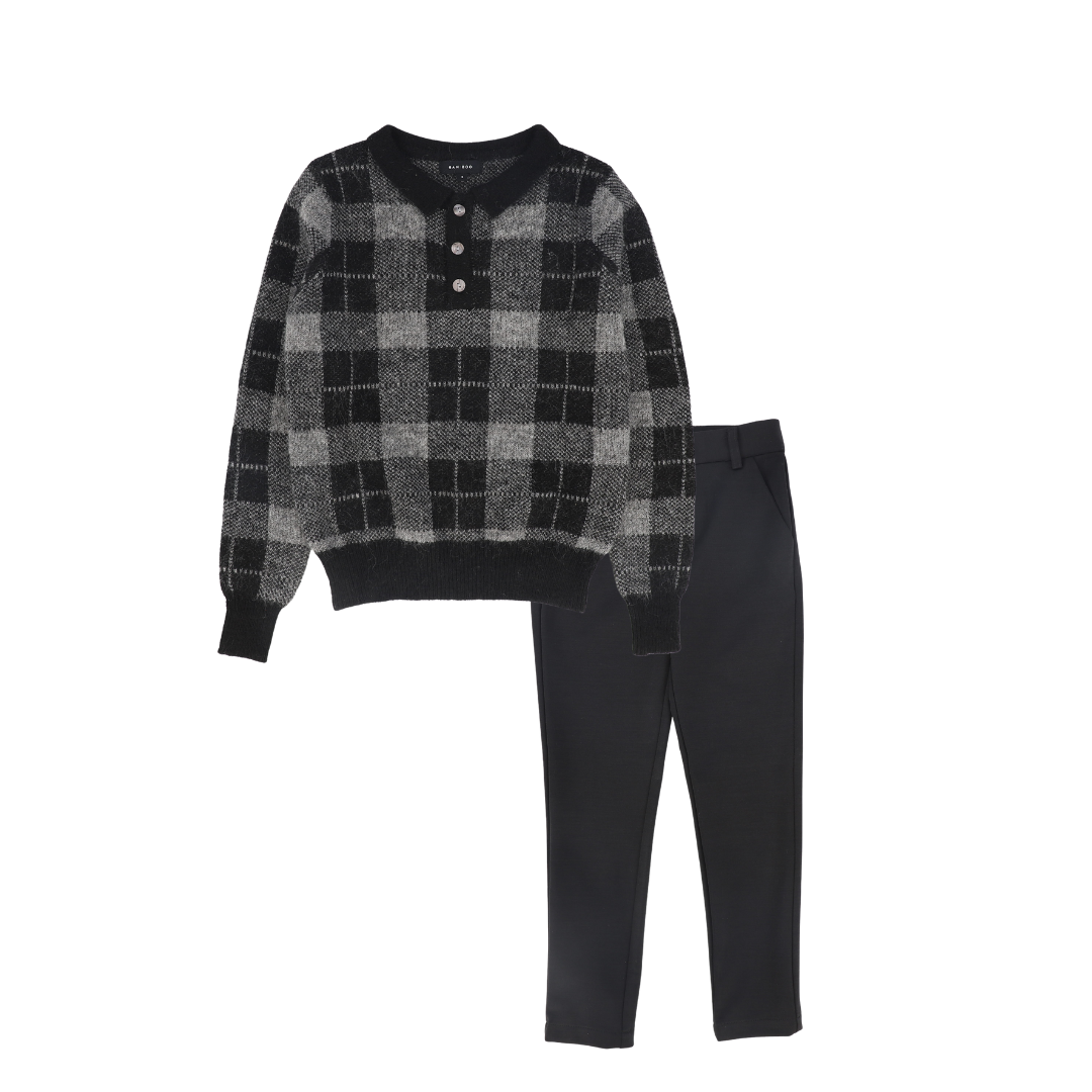 BAMBOO BLACK/CHARCOAL PLAID KNIT COLLAR SWEATER