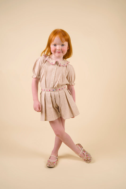 EARLY SUNDAY BEIGE EMBROIDERED TRIM PLEAT SKIRT