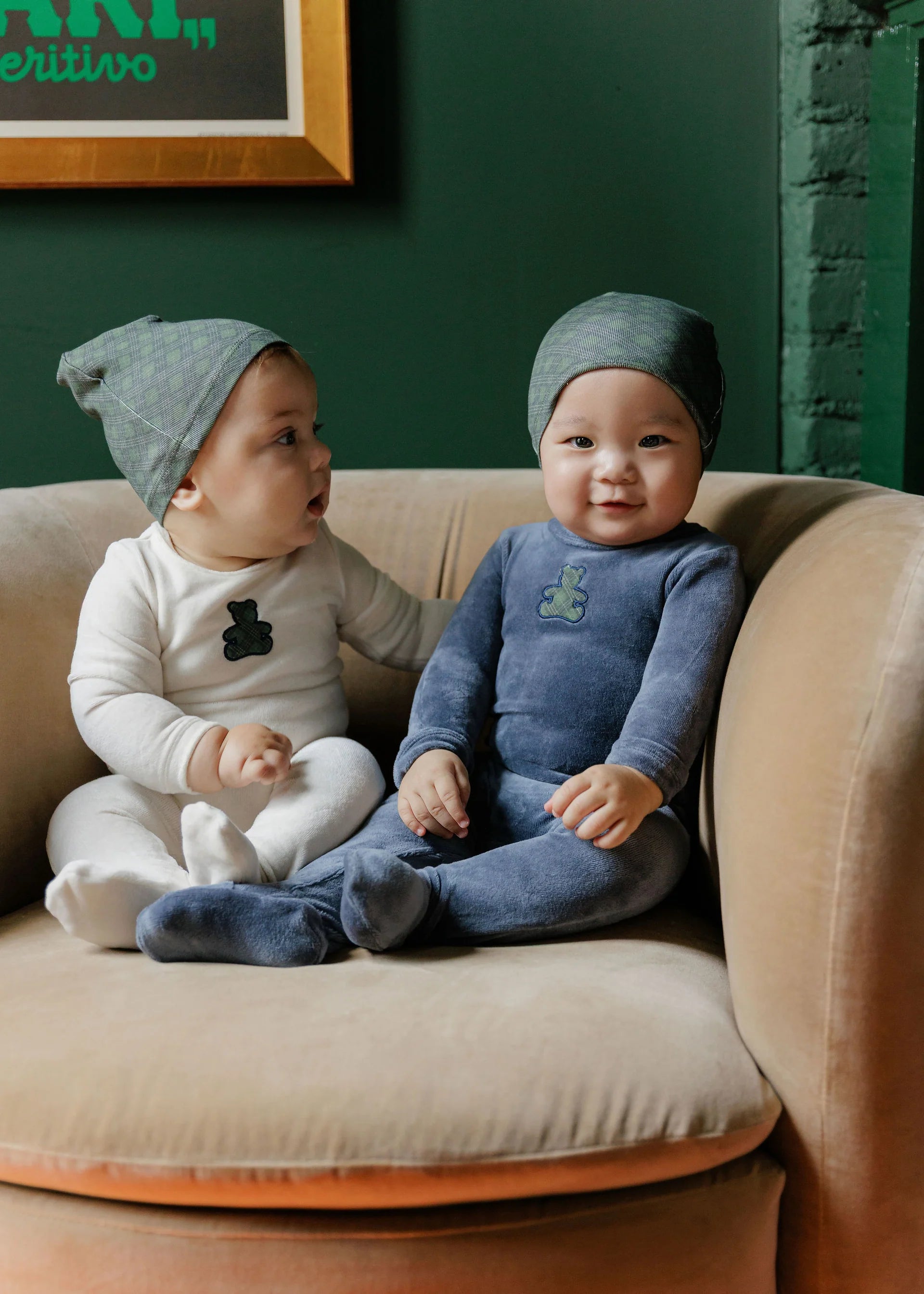 ELY'S & CO IVORY/BLUE VELOUR PLAID BEAR FOOTIE + BEANIE
