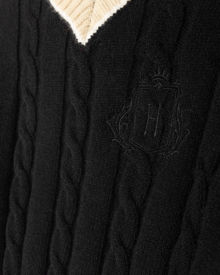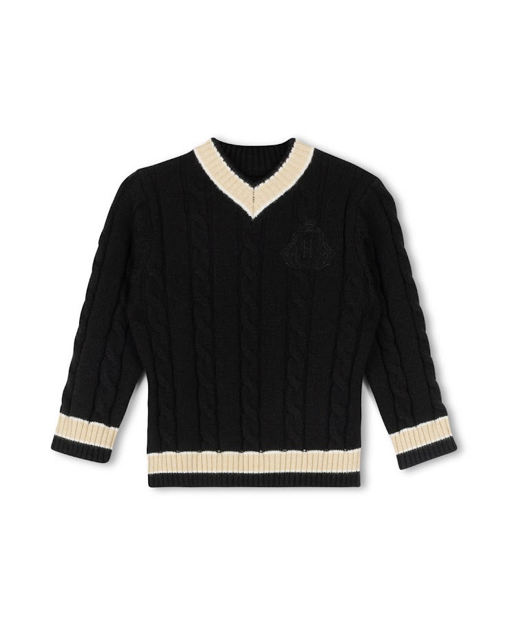 HARPER JAMES BLACK CHUNKY CABLE KNIT EMBLEM SWEATER
