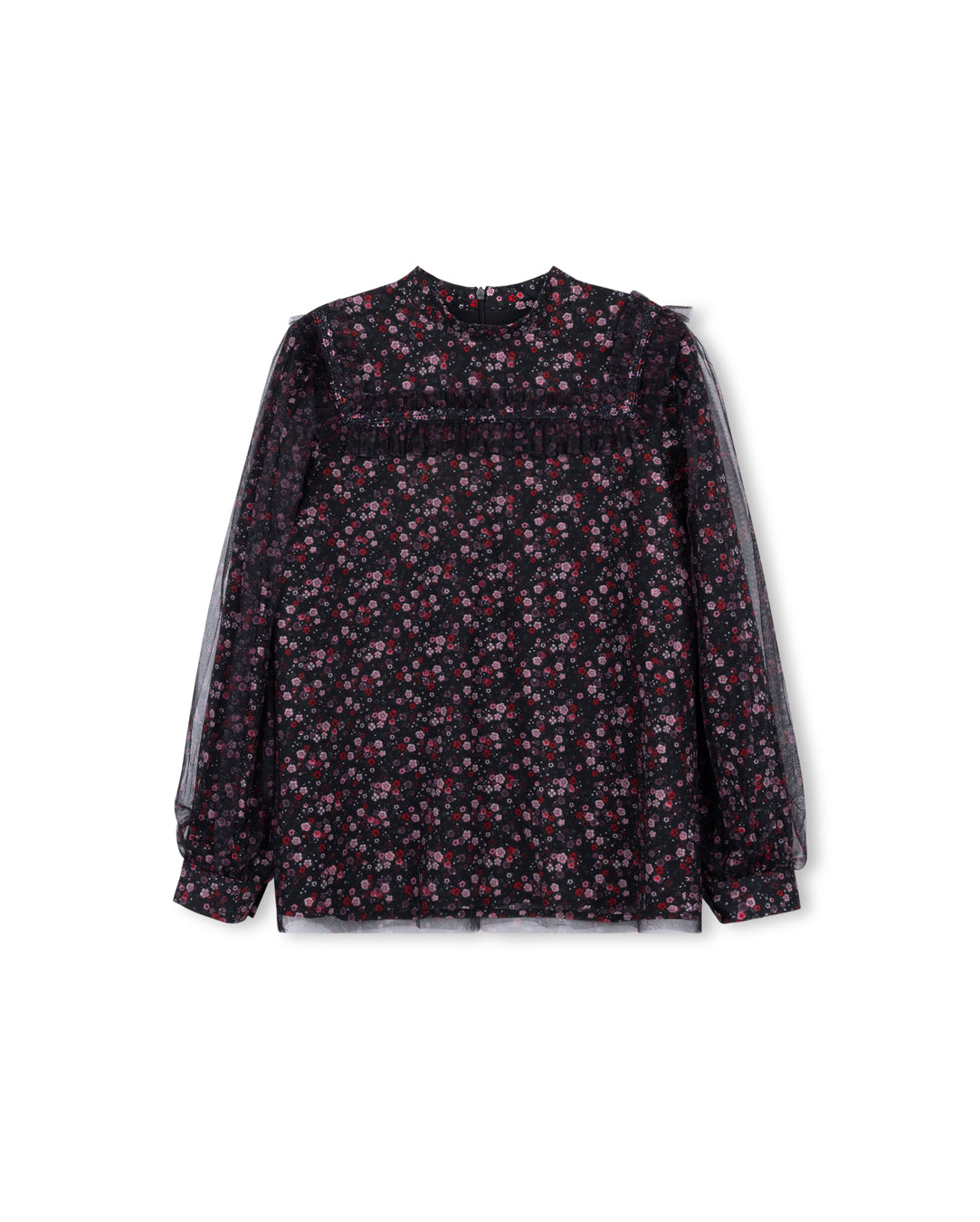 LILOU BLACK/PINK TINY FLORAL PRINTED TRIM TOP