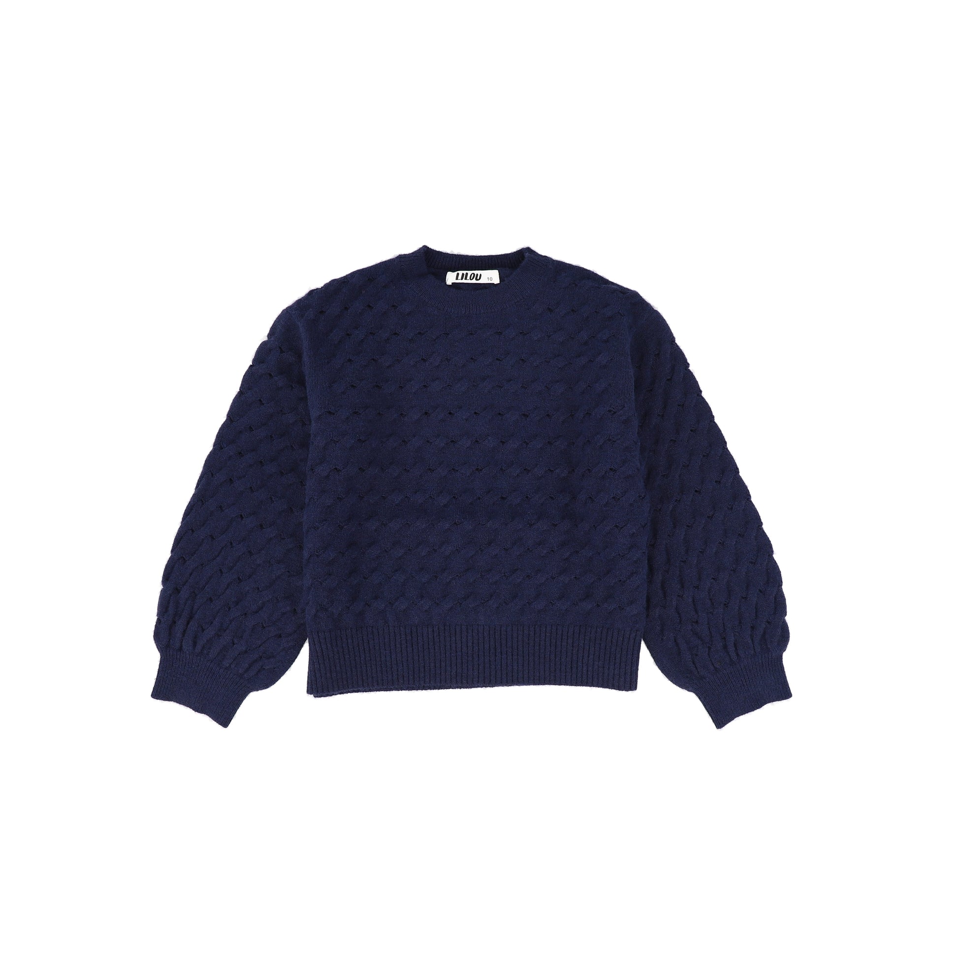 LILOU NAVY CABLE KNIT HOLE SWEATER