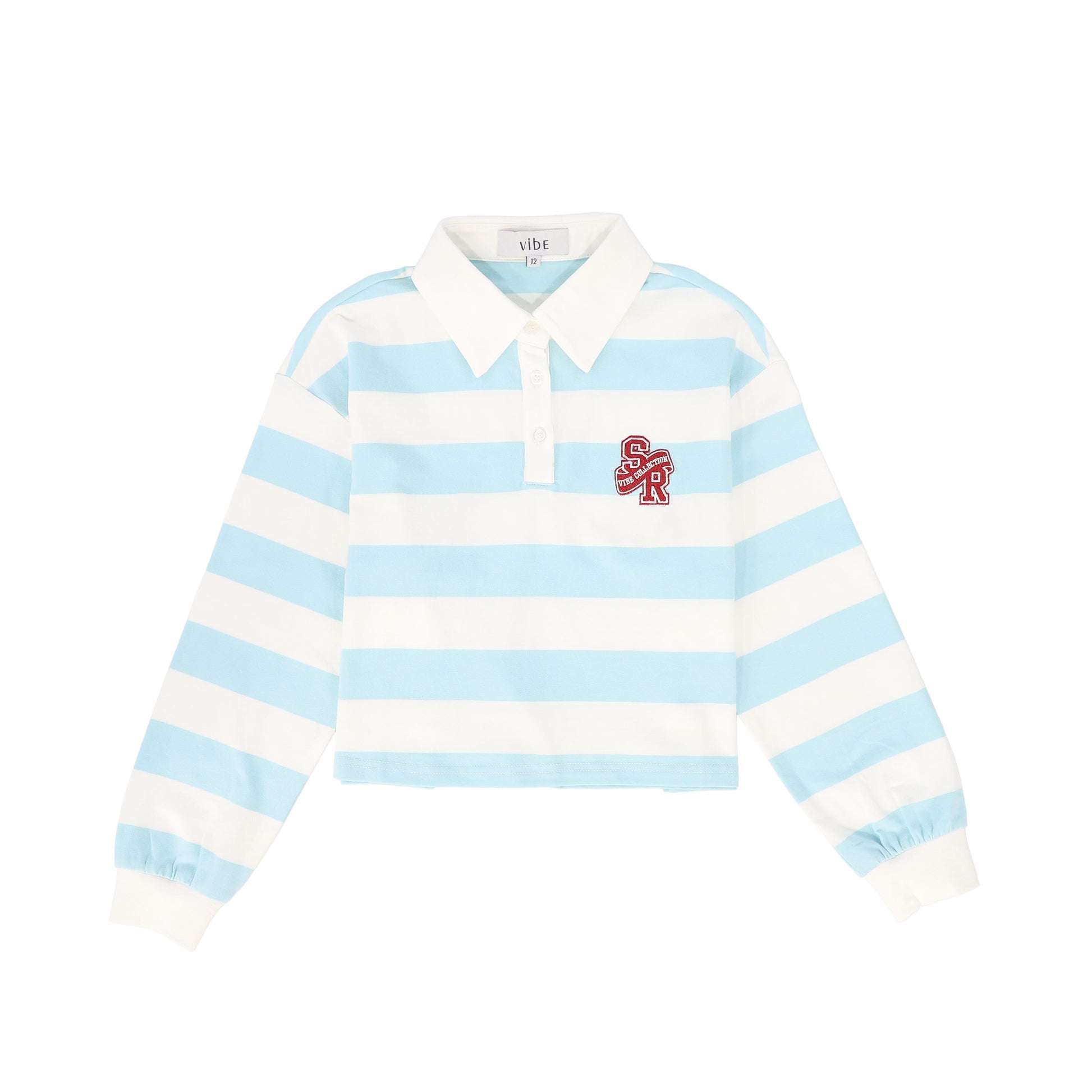 VIBE LIGHT BLUE CROP STRIPED OFF SHOULDER T-SHIRT
